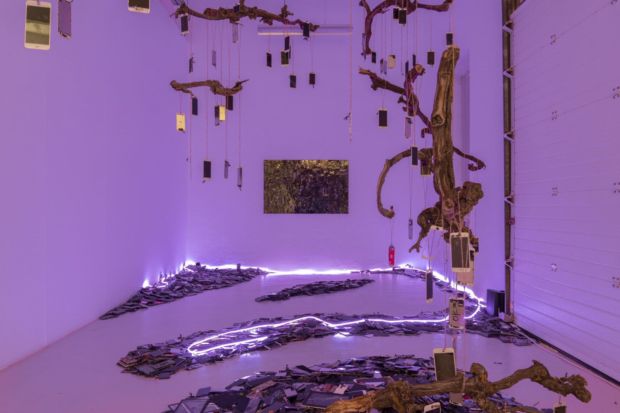 Así, el suelo de la sala viene cubierto por miles de carcasas de móvil, Un mar de dudas, recuperadas por el artista de tiendas que no se encuentran adscritas a las políticas de reciclaje. Estos residuos, la mayoría generados por materiales o minerales que proceden del suelo, vuelven a su estrato original una vez caídos de las ramas, permitiendo al espectador caminar sobre ellos y ser consciente de los residuos que se generan en la actualidad mediante la obsolescencia programada.